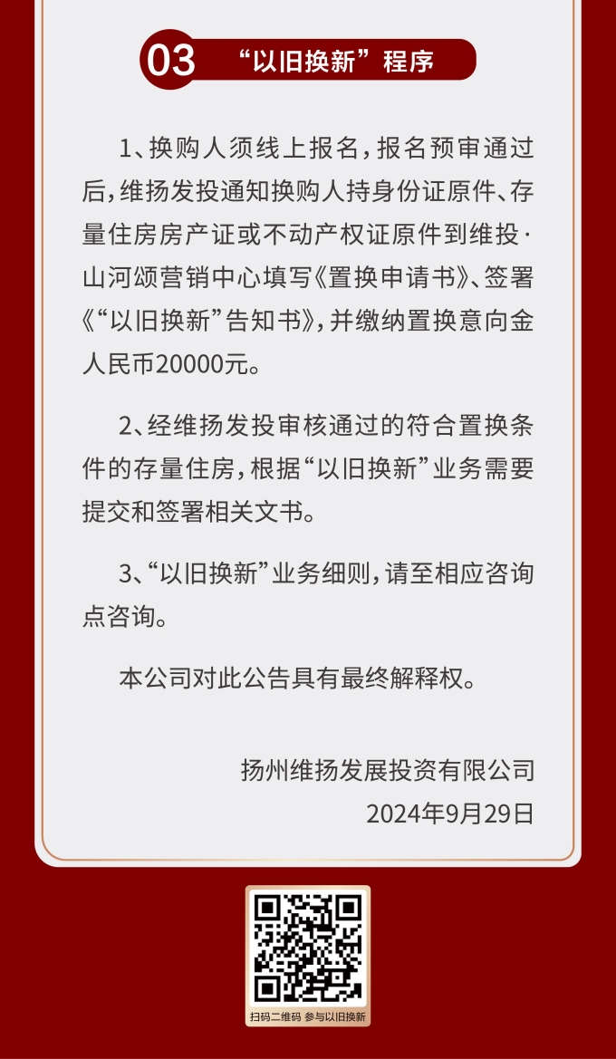 維揚(yáng)地產(chǎn)積極響應(yīng)政府新推行的“以舊換新”政策,踐行“惠民”理念,打造高品質(zhì)住宅,滿足揚(yáng)州人民改善型住房需求。此次維揚(yáng)發(fā)投“以舊換新”工作以其自主開發(fā)的維投·山河頌項目為試點,由國企背書、置換范圍廣、全流程專業(yè)服務(wù)。首批換購新建商品住房限額50套,換購人可通過登錄“維揚(yáng)發(fā)投商品住房‘以舊換新’線上報名系統(tǒng)”報名,具體要求詳見公告。