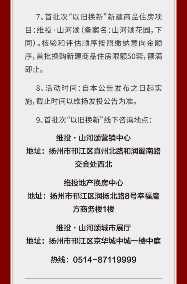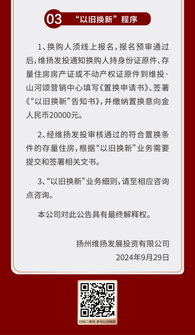 作為國(guó)企,維揚(yáng)發(fā)投積極響應(yīng)政府新推行的“以舊換新”政策,此次以其自主開發(fā)的維投·山河頌項(xiàng)目為試點(diǎn),由國(guó)企背書、置換范圍廣、全流程專業(yè)服務(wù)。自公布“以舊換新”消息以來,維投地產(chǎn)線下三個(gè)“以舊換新”咨詢地點(diǎn)人氣持續(xù)爆棚!前來咨詢的購(gòu)房者絡(luò)繹不絕。維投地產(chǎn)在開盤前就擺出誠(chéng)意,給足買房人信心。通過“以舊換新”,買房人可以直接置換明月湖畔聯(lián)排別墅,改善一步到位!目前首批推出的換購(gòu)新建商品住房限額50套“以舊換新”登記即將接近尾聲,感興趣的買房人抓緊時(shí)間辦理申請(qǐng)。