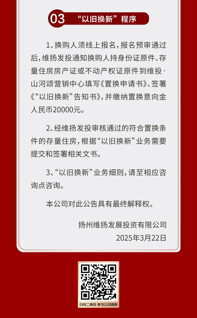 活動(dòng)現(xiàn)場(chǎng),不少客戶(hù)對(duì)以舊換新政策表現(xiàn)出濃厚的興趣,工作人員耐心為大家講解政策細(xì)則和辦理流程,整個(gè)操作簡(jiǎn)便快捷,購(gòu)房者只需通過(guò)線(xiàn)上報(bào)名,按照指引即可輕松操作,3.0版換購(gòu)新建商品住房限額100套,換購(gòu)人可通過(guò)登錄“維揚(yáng)發(fā)投商品住房‘以舊換新’線(xiàn)上報(bào)名系統(tǒng)”報(bào)名,具體要求詳見(jiàn)公告。在政策的加持下,維投·山河序的熱度持續(xù)攀升,爆款之勢(shì)已然成型。