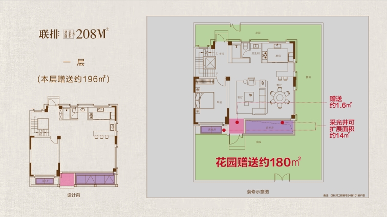 208戶型鑒賞: 大花園:戶均擁有約120㎡以上私屬庭院,可打造花園、茶室或親子活動(dòng)空間,延伸生活詩意 三開間:約10.7米南向面寬,首層層高約3.6 米,采光通風(fēng)俱佳,營造朗闊起居格局。 高附贈(zèng):地下室面積約108㎡,約 5.5 米挑高,可隔成兩層,打造影音室、健身房、酒窖等多元功能區(qū);一層餐客廳挑空,可拓展約43㎡贈(zèng)送空間;二層、三層配備景觀露臺,陽臺半贈(zèng)送;四層星空露臺全贈(zèng)送,解鎖生活多重想象。