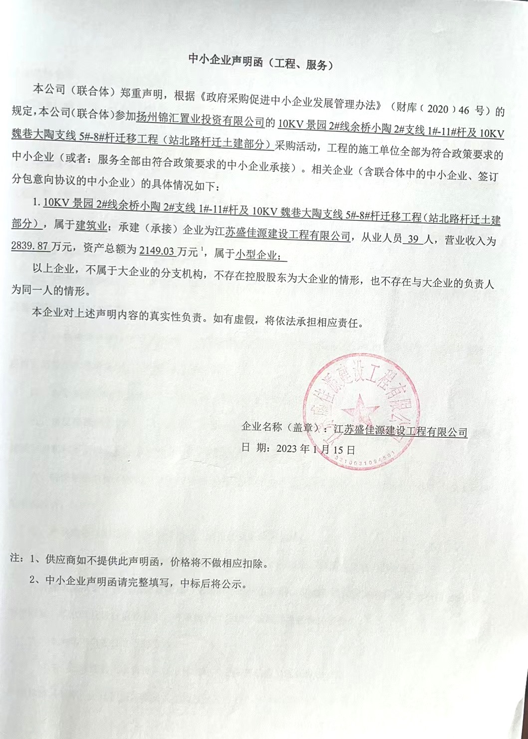 10KV景園2#線余橋小陶2#支線1#-11#桿及10KV魏巷大陶支線5#-8#桿遷移工程 成交結(jié)果公告 一、項(xiàng)目編號(hào):YZZY-20221202 號(hào) 二、項(xiàng)目名稱(chēng):10KV景園2#線余橋小陶2#支線1#-11#桿及10KV魏巷大陶支線5#-8#桿遷移工程(站北路桿遷土建部分) 三、成交信息: 供應(yīng)商名稱(chēng):江蘇盛佳源建設(shè)工程有限公司 供應(yīng)商地址:揚(yáng)州市邗江區(qū)望月路496號(hào) 成交金額:359700元(叁拾伍萬(wàn)玖仟柒佰元整) |